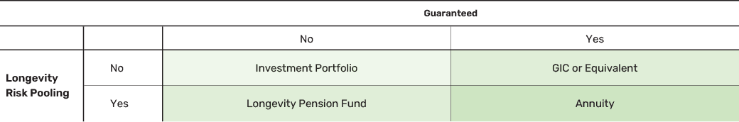 In the table below, we can think of a GIC or savings account as a guaranteed product for people saving for retirement, guaranteed to not drop in value, but unlikely to rise much either; an annuity is its counterpart with longevity risk pooling built in. On the other hand, a balanced investment portfolio is not guaranteed and accepts some market risk, and should therefore rise over time in most situations; the Longevity Pension Fund is its equivalent with longevity risk pooling built in.